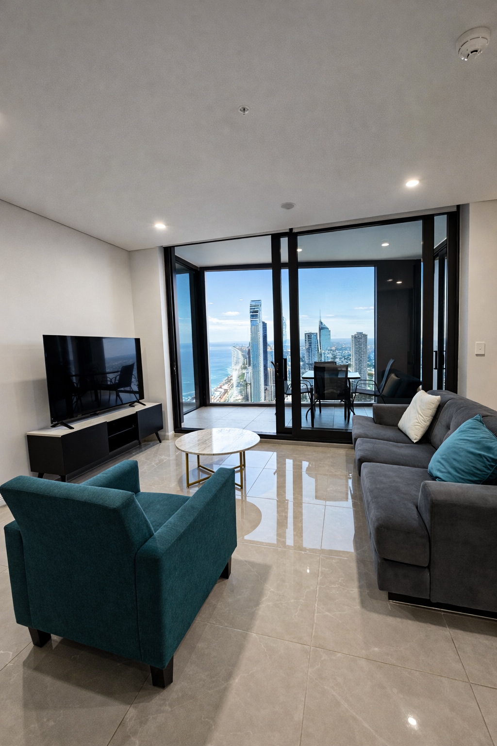 Enjoy a luxury stay at our stunning Circle On Cavil apartment. Located on level 41 with amazing 180 degree views across the ocean and hinterland. Centrally located to all shops, beaches & Cavil Avenue. Relax and enjoy the best views on your own private balcony. Full kitchen, luxury spa bath, the living room is fitted with King Furniture. Both bedrooms fitted with quality pillow top mattresses. Walk to the beach No car needed - catch a tram to Broadbeach, or a bus to all the theme parks.