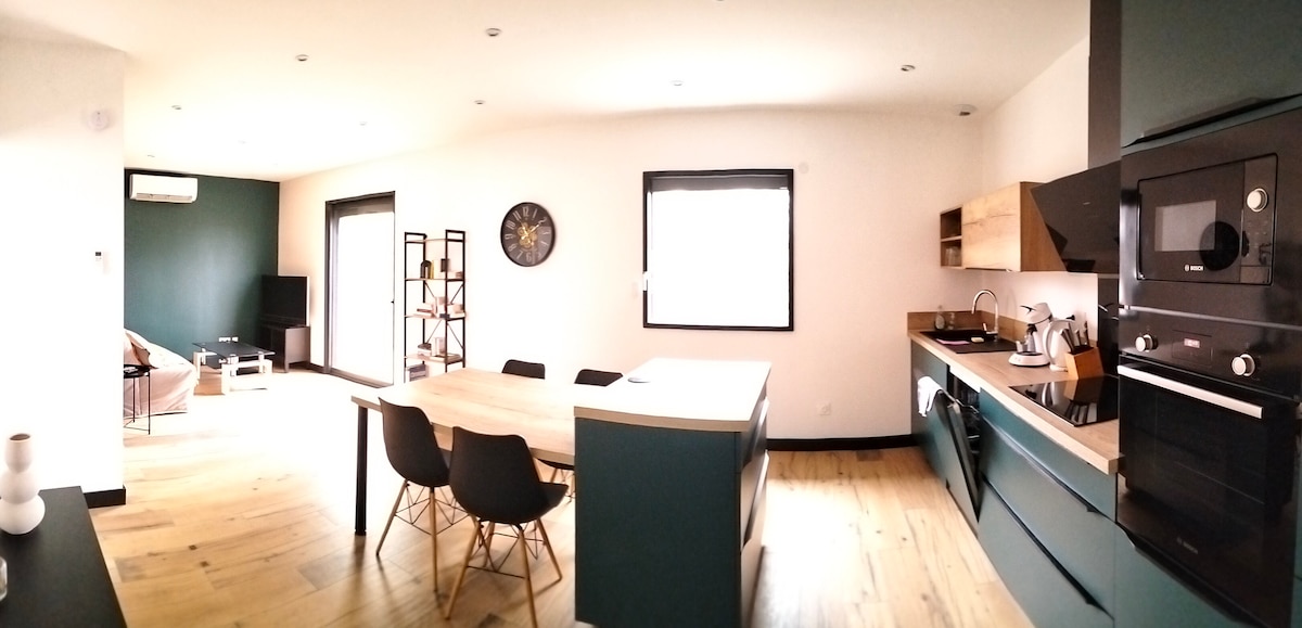 Nous serons heureux de vous accueillir dans ce logement neuf et entièrement équipé situé au rez de jardin de notre maison. Composé d'une chambre (lit 160x200), d'une salle de bain (douche) et d'une cuisine équipée ouverte sur le salon avec canapé-lit (160X200). Draps, serviettes et ménage sont inclus. L'entrée indépendante se fait par la terrasse privative où vous pourrez profiter d'une superbe vue sur les monts du forez. Situé à 5 min des axes autoroutiers. Au plaisir de vous recevoir!