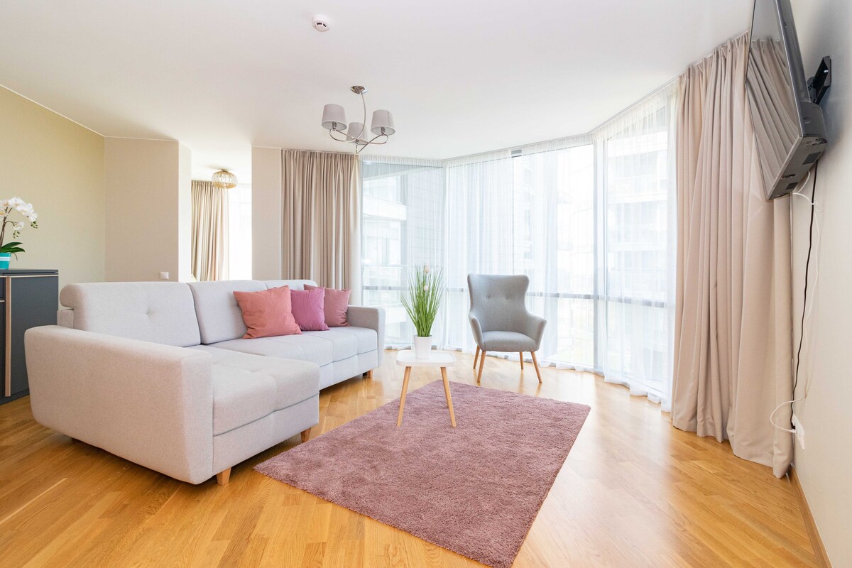 Stylish 2BR Seaside Apartment with Panoramic Views Modern 2-bedroom, 2-bathroom apartment in the Elija complex, featuring stunning sea views. Just minutes from the beach and pine forest. • Panoramic windows with sea views • Fully equipped kitchen • Master bedroom + sofa bed • 2 workspaces with high-speed internet • 12km from Palanga center • Near scenic Ošupis trail Perfect for beach lovers and remote workers alike!