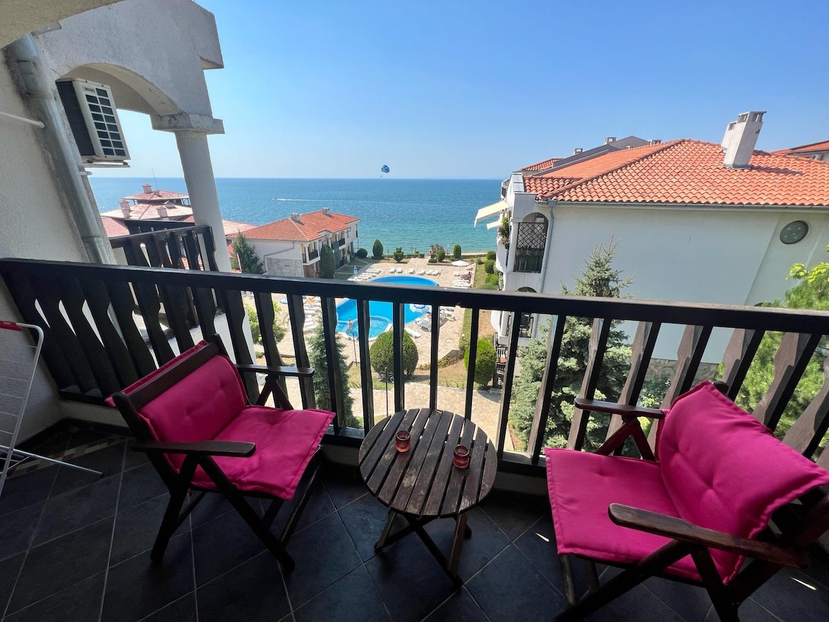Witamy w wyjątkowym apartamencie wakacyjnym z pięknym panoramicznym widokiem na morze i Nessebar ,z ogromnym tarasem, na którym przyjemnie jest spotkać wschody i zachody słońca Przytulne, klimatyczne i świąteczne Apartament znajduje się zaledwie 180 m od plaży Na terenie znajduje się basen z leżakami ,restauracja , tereny rekreacyjne W apartamencie znajduje się umeblowany salon z kuchnią,wszystkie niezbędne urządzenia , prysznic i sypialnia z panoramicznymi oknami Będziesz mógł się zrelaksować i cieszyć pobytem