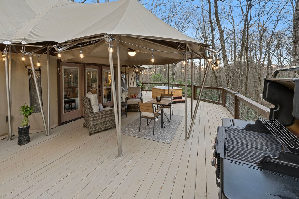 Come and experience a luxury African Safari Tent nestled in the Smoky Mountains. This top-end tent has all the comfort and amenities of home while being surrounded by nature in a tranquil wooded backdrop. The space has an open-floor concept with studio-style living, one bed, one bath, a full kitchen and living area, and outdoor living space in a serene setting. The large wrap-around deck with a covered sitting area, hot tub, and sweeping elevated views feels like a tree house!