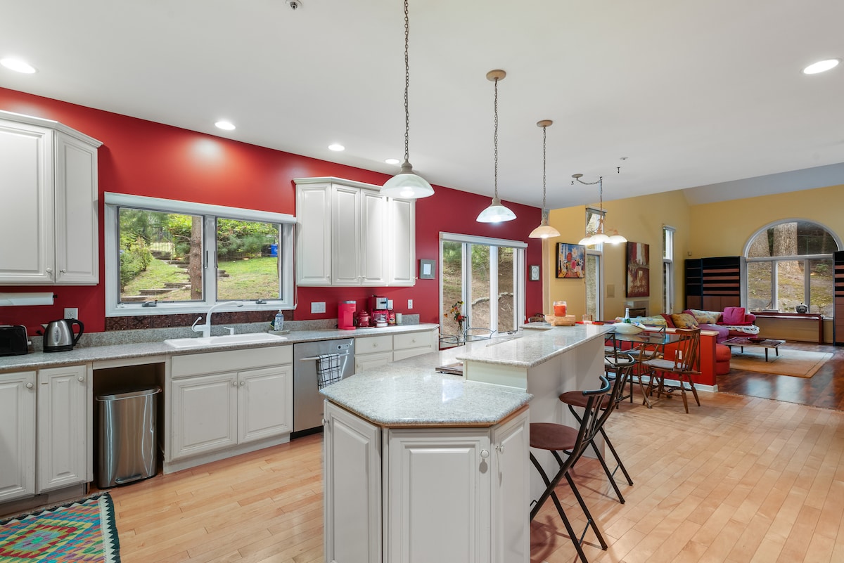 Mieszkanie na drugim, trzecim piętrze. Apartament obejmuje główną sypialnię z pełnowymiarowym łóżkiem oraz sypialnię gościnną z 2 pojedynczymi łóżkami. Prywatna łazienka. Jest jadalnia z lodówką, zlewem, kuchenką mikrofalową, indukcyjnym tosterem konwekcyjnym, ekspresem do kawy, francuskim stołem do prasowania, Alexą i telewizorem LCD. Jadalnia NIE ma KUCHENKI. Pokój medytacyjny na 3 piętrze ze świetlikami i częścią wypoczynkową z telewizorem LCD. CAŁA POWIERZCHNIA APARTAMENTU JEST PRYWATNA. Dom z tyłu graniczy z lasem i tylnym ogrodem. BRAK OPŁAT ZA SPRZĄTANIE.
