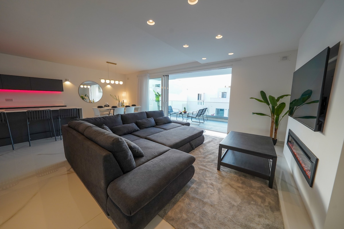 Piękny, przestronny, przyjazny rodzinie i pracy apartament z obsługą i widokiem w najbardziej poszukiwanej dzielnicy mieszkaniowej Melliehy. Apartament jest w pełni klimatyzowany, a na tarasie znajduje się prywatne jacuzzi dla 2/3 osób. Goście mają również dostęp do w pełni wyposażonej siłowni w tym samym budynku. Apartament znajduje się 15 minut spacerem od największej piaszczystej plaży Malty (2 minuty samochodem) i stosunkowo blisko wszystkich udogodnień, w tym supermarketów, sklepów, fryzjerów itp.