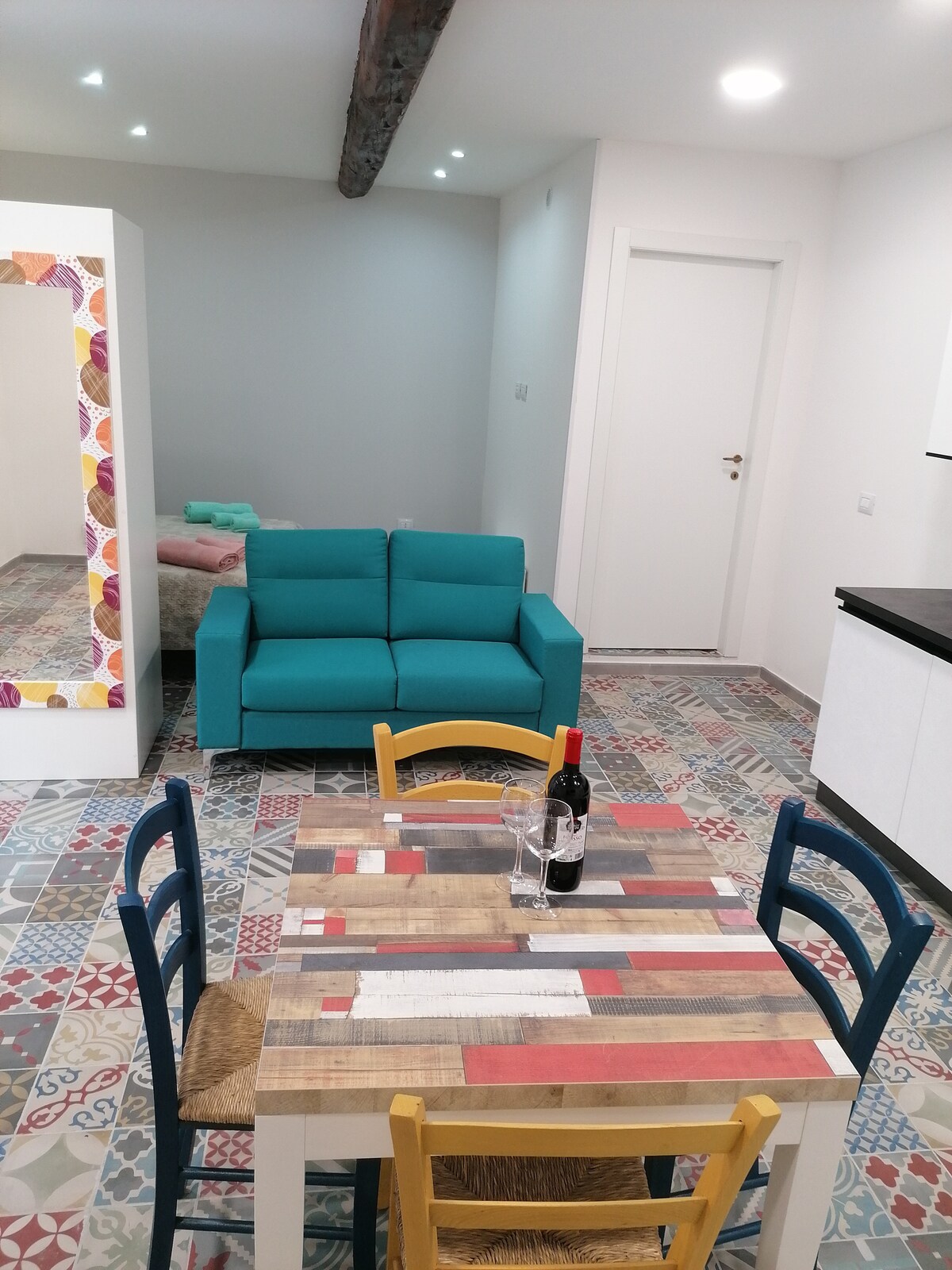 100-metrowy loft na parterze szlachetnego budynku, może pomieścić do 7 osób. Prywatne podwórko i zadaszony taras na świeżym powietrzu, na którym można zjeść. 120 m od wyposażonego Solarium Neptune do kąpieli w Morzu Jońskim i 400 m od Piazza Duomo. Posiada 3 sypialnie (2 zamknięcia z drzwiami i jedno z zasłoną), 2 łazienki, 2 sofy w salonie, 50-calowy telewizor, klimatyzację i ogrzewanie, kuchnię z piekarnikiem, toster, kuchenkę indukcyjną. Pranie z żelazkiem, deską do prasowania i suszarką.