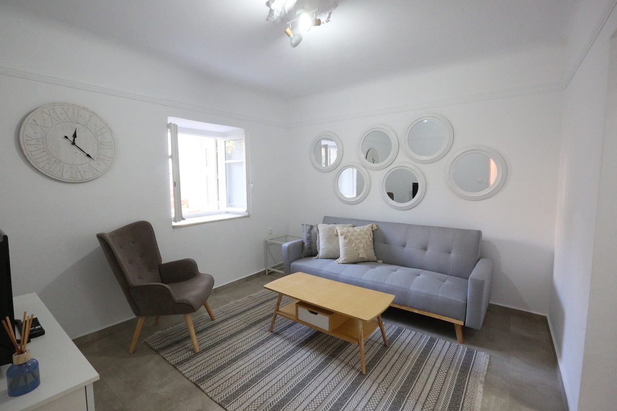 Nowoczesne mieszkanie o powierzchni 60 m², całkowicie odnowione, obok portu i dworca autobusowego, bezpośredni dostęp do apteki i supermarketu. 5 minut spacerem od placu Miaouli. Posiada pralkę/suszarkę, klimatyzację, kuchenkę elektryczną, słoneczny podgrzewacz wody, WiFi i żelazko.