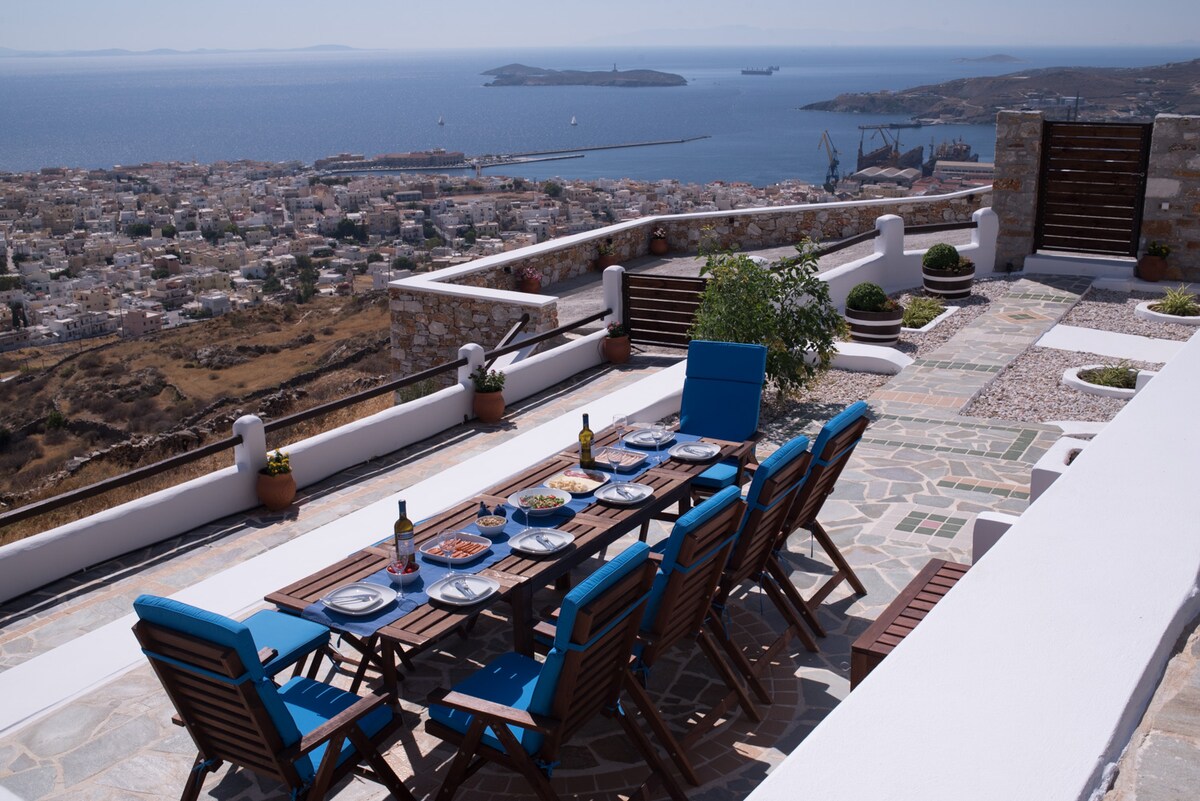 Z rozległymi widokami na morze, port i miasto, dom znajduje się 4 minuty od centralnego rynku i historycznego centrum, kawiarni/barów, sklepów i usług publicznych. Widok z dużego tarasu wieczorem zachwyca światłami ze statków, budynków i wysp Tinos i Mykonos. Do transportu na plaże, taksówką i autobusami, odległość wynosi 5 minut spacerem. Można do niego dojechać samochodem, który można zaparkować na pobliskich ulicach.