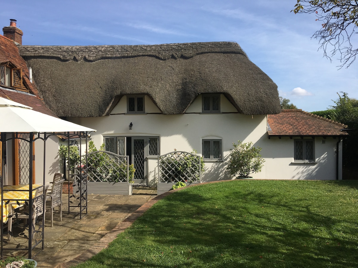 Beautiful thatched cottage annexe on edge of farmland, with 3 double bedrooms (one adjoining), 2 ensuite bathrooms, beamed living/dining area, well equipped kitchen. King sized beds. Unrestricted access to beautiful large fenced and hedged garden set in 3 acres. Secluded outside dining area under a gazebo. 4 ring gas bbq and fire pit. Exclusive use of cedar hot tub till 10.30pm for a one off payment of £60. Continental breakfast first day. Dogs welcome but not to be left unattended in property.