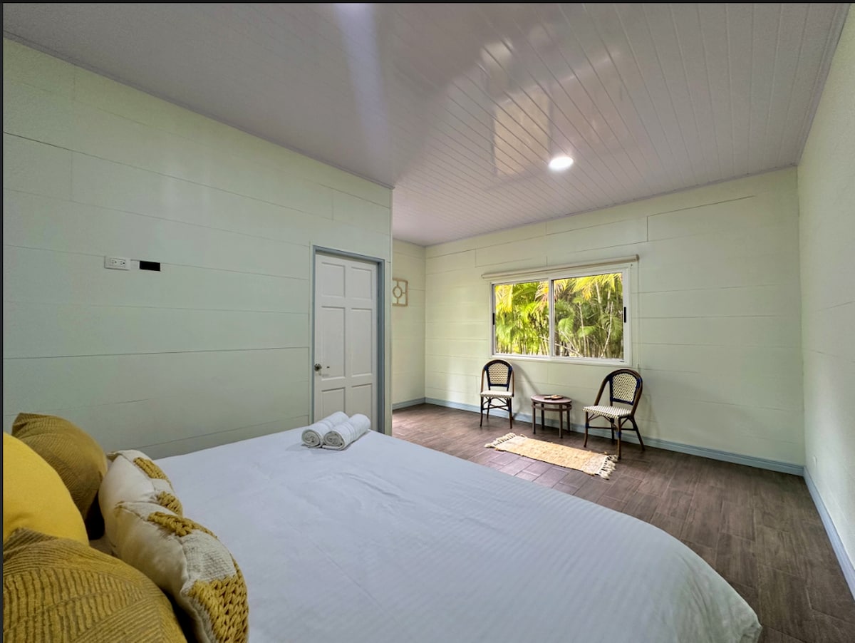 Escape the bustling town at Los Nidos Tropicales! A cozy retreat for up to 5 guests, featuring 2 bedrooms and 1 bathroom with air conditioning in each bedroom. Enjoy your morning on the open porch and observe nature. You will have privacy in our lush garden, perfect for families with children but also birdwatchers. Only a 5 min walk to the beach and 7 min walk to the little supermarket next to the hotel Banana Azul. Enjoy dinner at Soda Mirna closeby. 10min by car to center of Puerto Viejo.
