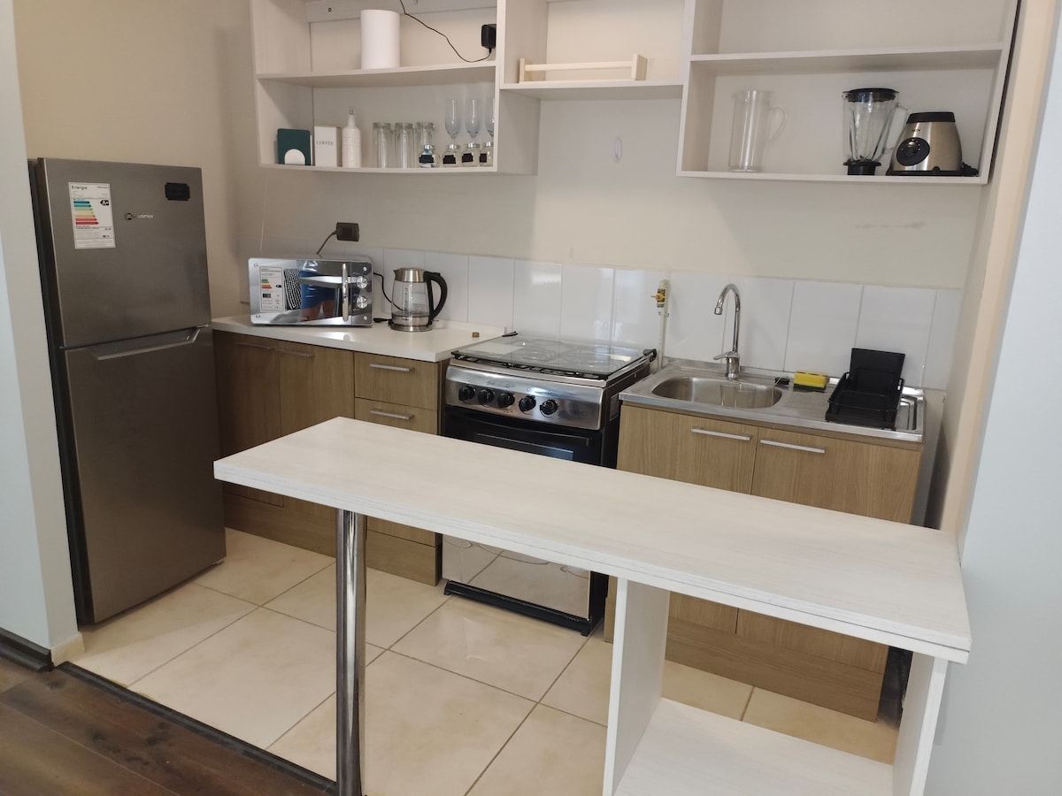 Ciesz się tym pięknym jasnym, wygodnym i centralnym apartamentem w Talca. W pełni wyposażone dla 5 osób, z doskonałą lokalizacją i łącznością. 5 minut od stadionu fiskalnego Talca, w pobliżu Uniwersytetu Santo Tomás, supermarketu Jumbo, aptek i sklepów, aby cieszyć się idealnym pobytem. Funkcje - 2 sypialnie - 1 łazienka - Salon z jadalnią - W pełni wyposażona kuchnia - Gated Condo with 24/7 Concierge -WiFi - Parking prywatny