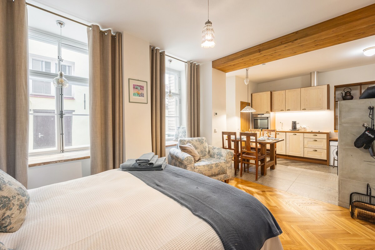 Ten przytulny, uroczy apartament znajduje się w samym sercu Starego Miasta w Tallinie. Jest to dla Ciebie idealny dom z dala od domu - mieszkanie jest pełne średniowiecznego charakteru, którego początki sięgają XV wieku, z odsłoniętym wapiennym kamieniem, drewnianymi belkami i średniowiecznym malowidłem.Mieszkanie znajduje się na nieco innych poziomach i jest bardzo interesujące. Posiada jedną sypialnię z podwójnym łóżkiem, w pełni wyposażoną kuchnię, łazienkę z jacuzzi, działający kominek, WIFI i pralkę.