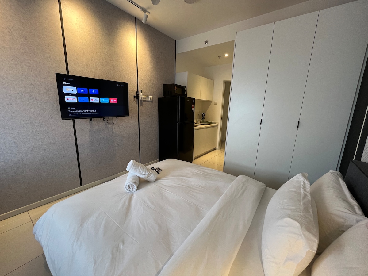 Explore our cozy studio, which can accommodate 2 to 3 people with a queen bed and a sofa bed. Only a 15-minute drive from KLIA T1/T2, the place is surrounded by many restaurants, fast food branches, groceries, and laundry shops, all within walking distance. Savor all the amenities, including the kids’ playground, BBQ area, gym, and swimming pool, with 24/7 security. * Unavailable drop your luggage before check in hours.Due to building designed, need to walk 10 steps staircase to get elevator.