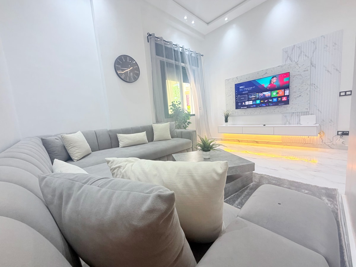 Villa de lujo con piscina grande privada auto-limpiante a 5 km de Cabo Negro y a 3 km del aeropuerto de Tétouan y McDonald’s. Con 2 habitaciones y 2 salones (uno con 4 sofás cama) para 8 adultos, cocina equipada, baño modernos, jardín con iluminación que se enciende al atardecer, zona de barbacoa y parking para 3 vehículos. Limpieza y mantenimiento garantizados. No se permiten fiestas , solo huéspedes respetuosos. Incluye climatizador automático