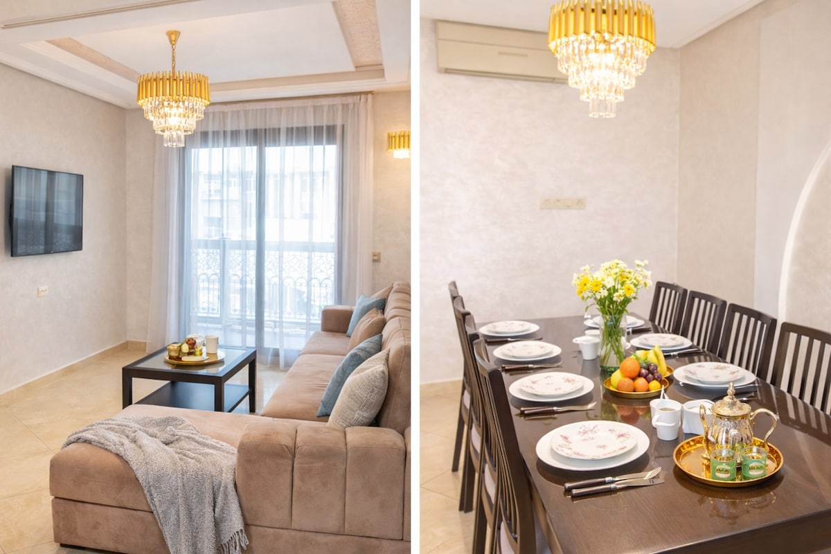 “Profitez d’un séjour au cœur de Tanger 🌴 Appartement idéalement situé dans l’hypercentre, à quelques minutes à pied de la plage, de la marina et des commerces. Situé dans une résidence sécurisée avec ascenseurs, caméras et gardiens. Parfait pour un séjour en famille ou entre amis, avec Netflix et IPTV à disposition pour vos soirées détente. Parking en sous-sol disponible en supplément.”