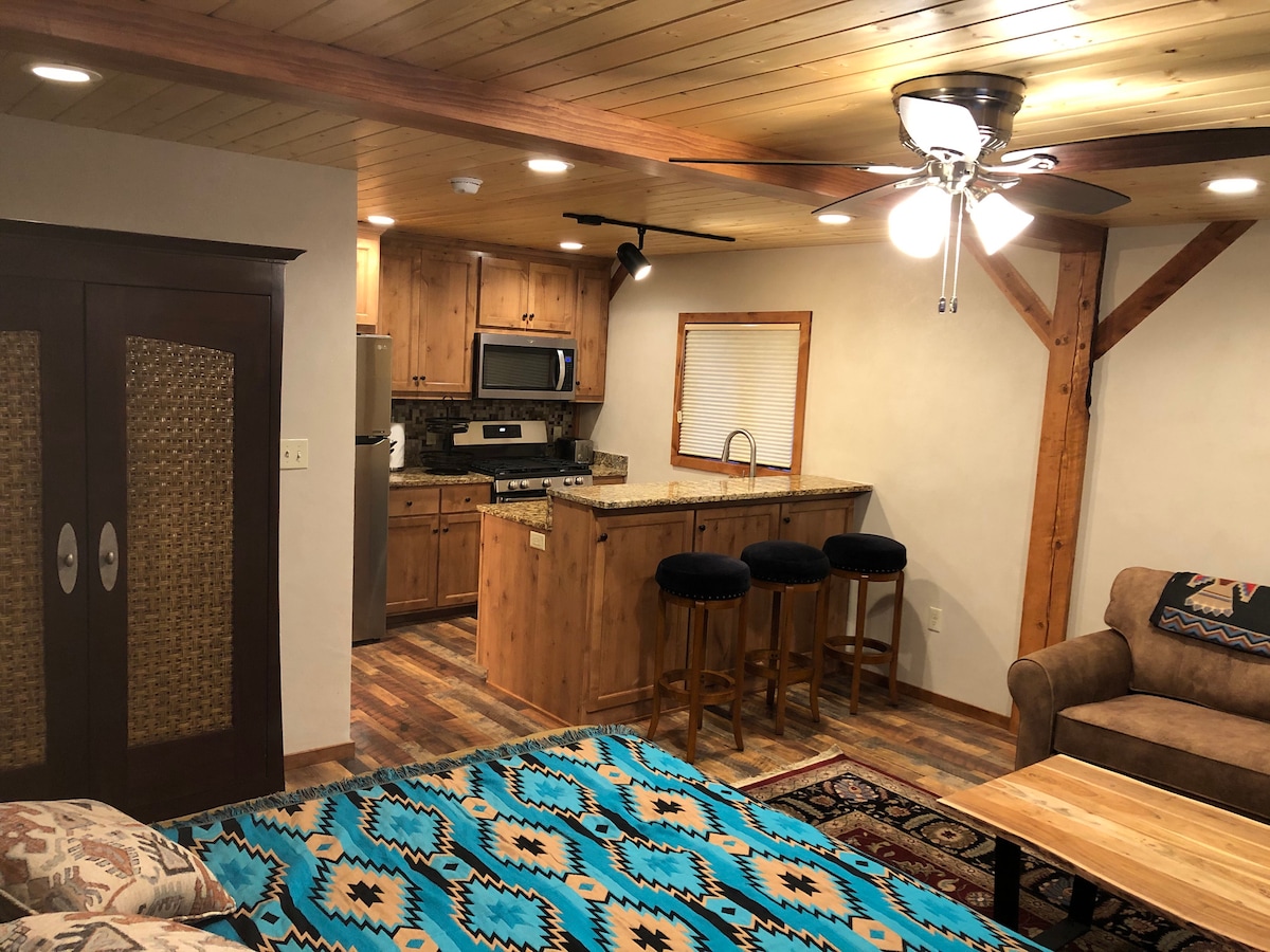 Przytulne studio 1,5 mili od bazy Taos Ski Valley, nad brzegiem rzeki Rio Hondo. Nowo odnowione! Jedno łóżko typu queen, jedna rozkładana sofa, kominek i balkon z widokiem na rzekę i las krajobrazowy. Goście mogą skorzystać ze wspólnej pralki/suszarki i maszyny eliptycznej. Wspaniałe miejsca na piesze wycieczki i wędkowanie tuż za drzwiami! Posiadamy również inne studio w tym samym kompleksie, które może pomieścić 4 osoby i można je wynająć w tym samym czasie, w zależności od dostępności.