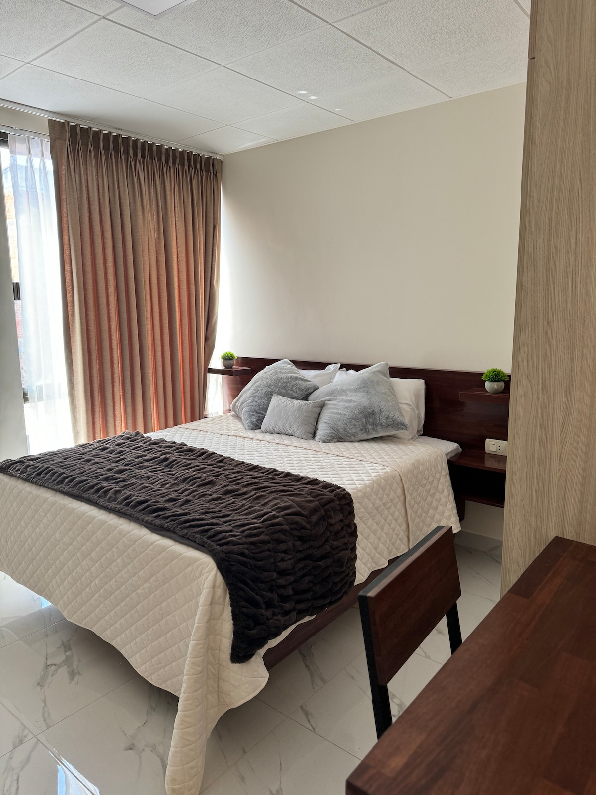 W samym sercu miasta Tarija, przy alei Las Américas, zaledwie 3 minuty spacerem od głównego placu i katedry, w pobliżu restauracji, kawiarni, sklepów i całodobowej apteki, ten apartament typu studio jest idealny dla osób podróżujących w pojedynkę lub par odwiedzających Tariję. Obejmuje on: – Podwójne łóżko (2½ miejsca) – zlewozmywak i czajnik elektryczny – Stół z krzesłami i zastawą – Smart TV i Wi-Fi - Prywatna łazienka Wspólne udogodnienia obejmują kuchenkę mikrofalową, deskę do prasowania i wodę butelkowaną.