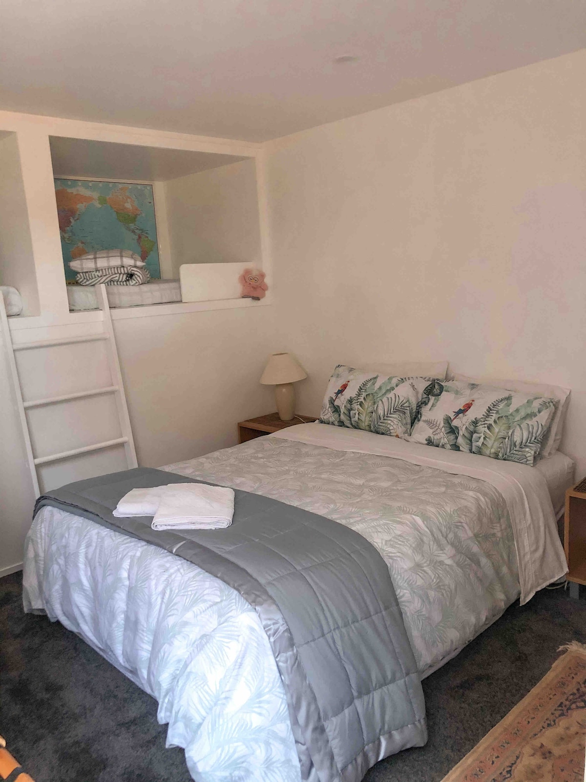 Słoneczny apartament na dole z dwiema sypialniami typu queen, obie z prywatnymi łazienkami, aneksem kuchennym/pralnią (bez kuchenki lub piekarnika) i salonem/salą gier, z tenisem stołowym i grillem na świeżym powietrzu z płytą grzewczą. Własne wejście i wszystko oddzielone od naszego głównego domu na górze. Jest nowoczesny, lekki i przestronny z wysokiej jakości wyposażeniem i pościelą oraz parkingiem poza ulicą. W pobliżu można pływać łódką, łowić ryby, grać w golfa, wędrować i jeździć na rowerze górskim, a także odwiedzić niesamowite restauracje i kawiarnie. Idealne dla jednej lub dwóch par i rodzin.