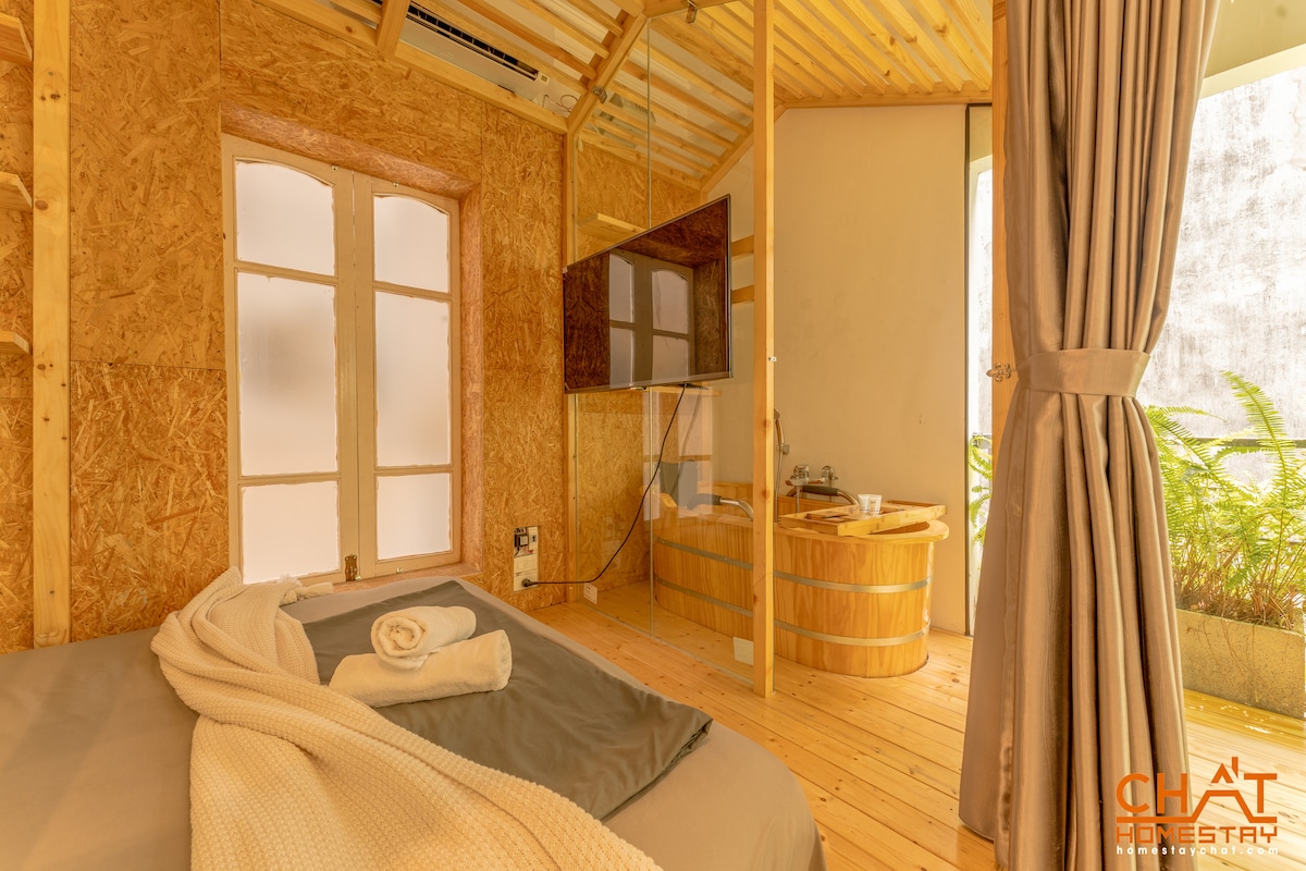 A cozy studio with natural wood design and a private open-air balcony filled with greenery. It's on the 4th floor of a building located in a safe and quiet neighborhood near Trúc Bạch Lake. Perfect for solo travelers or couples seeking a peaceful retreat. Mrs. Nghĩa is available right at the building to warmly assist you offline every day from 9:00 AM to 4:30 PM.