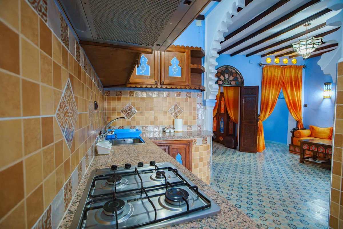 An apartment in the traditional Chefchaouen style, which gives you a unique experience from ordinary apartments. It consists of two bedrooms, a living room, a kitchen, a bathroom and a shower with a terrace with a wonderful view of nature and mountains. Located on the fourth floor (80 stairs only) It is located 700 meters from the Old Town. It is located near the weekly market.