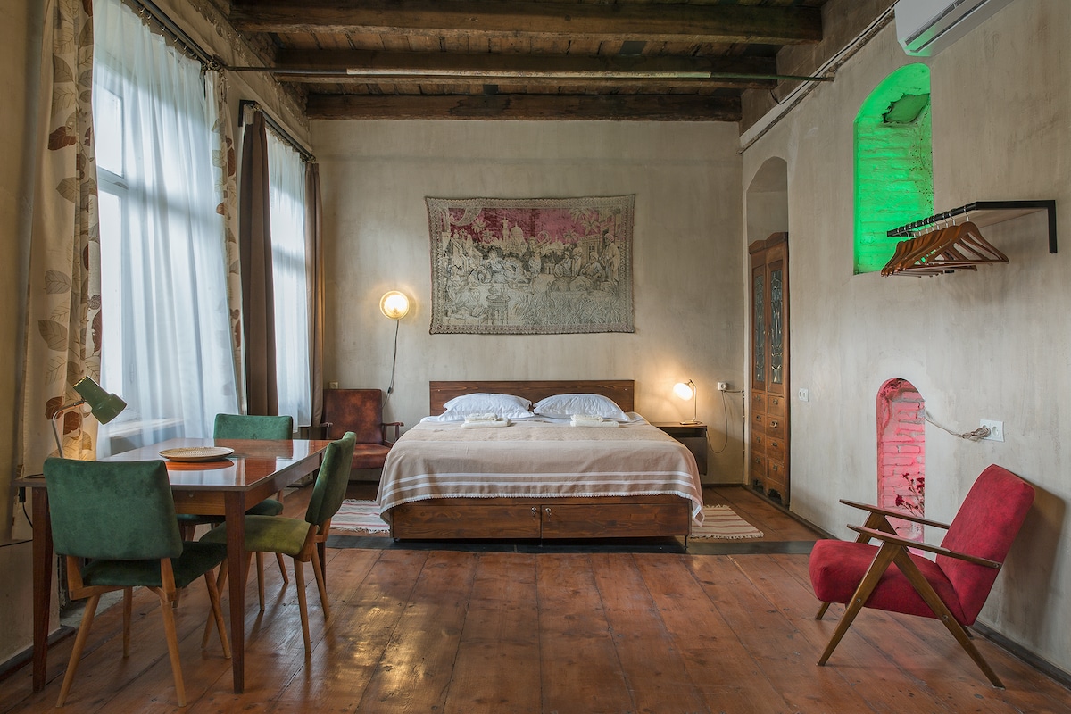 This is a comfortable renovated apartment with exposed brick that has a true Tbilisi feeling. This studio has a transparent bathroom with modern bathtub, king size bed, Chesterfield sofa and etc. The space fits 2 & is centrally located on a historic pedestrian street. High speed WIFI Internet & IPTV (intl. Channels) is provided free of charge. The apartment is also well located for transport: Metro Marjanishvili & bus stations are walk distance and takes you anywhere in Tbilisi in a short time.