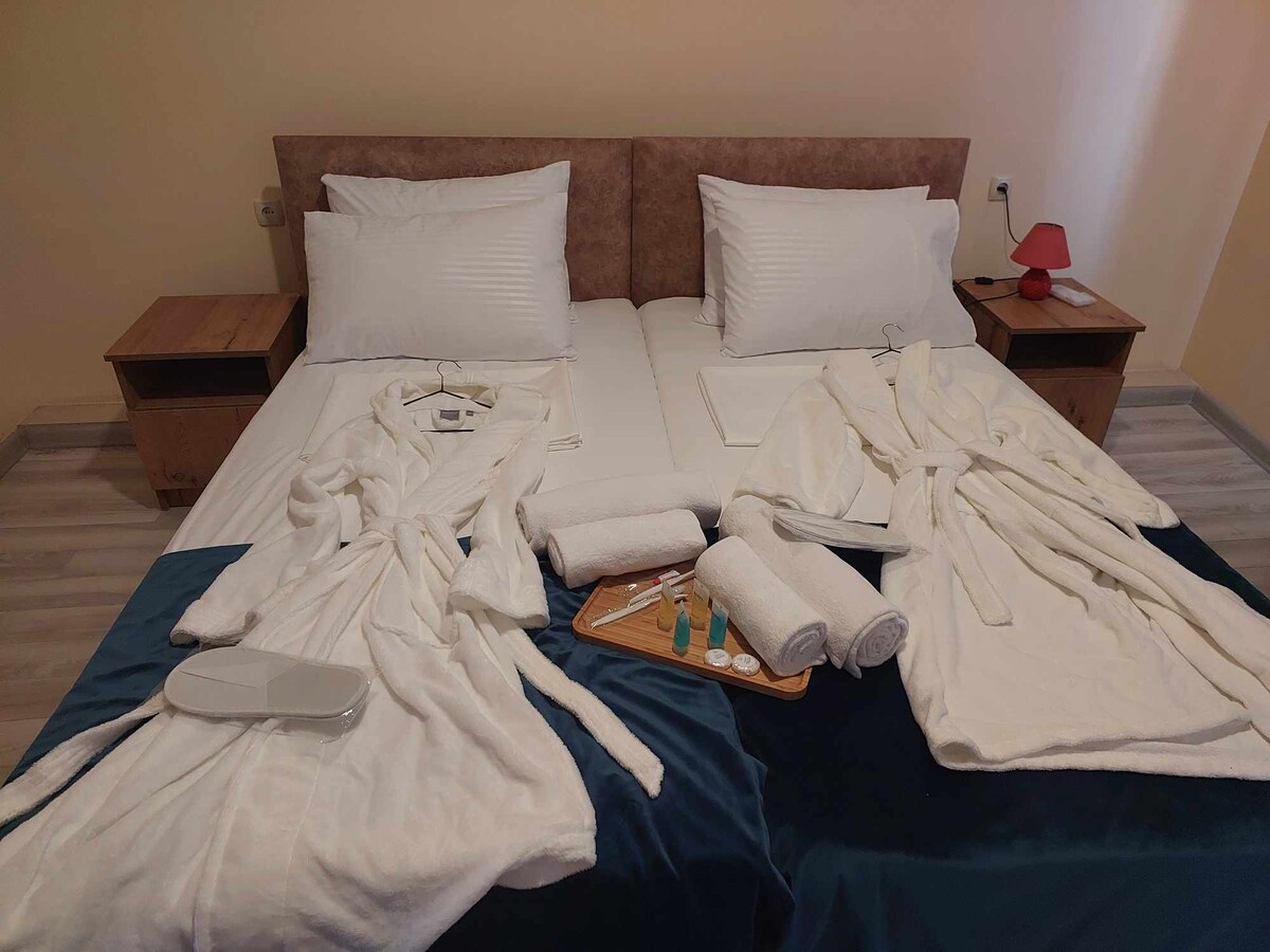 Jasny pokój z dwoma łóżkami typu queen, idealny dla małych rodzin lub grup czteroosobowych. Obejmuje prywatną łazienkę z kabiną prysznicową, bezpłatne Wi-Fi, telewizor, sejf, minilodówkę i czajnik elektryczny z kawą i herbatą. Świeże ręczniki, pościel i przybory toaletowe. Dostępny wspólny aneks kuchenny i przestrzeń do pracy. Ten pokój wychodzi na tyły budynku. Położony w centrum Vake. Bezkontaktowe zameldowanie/wymeldowanie