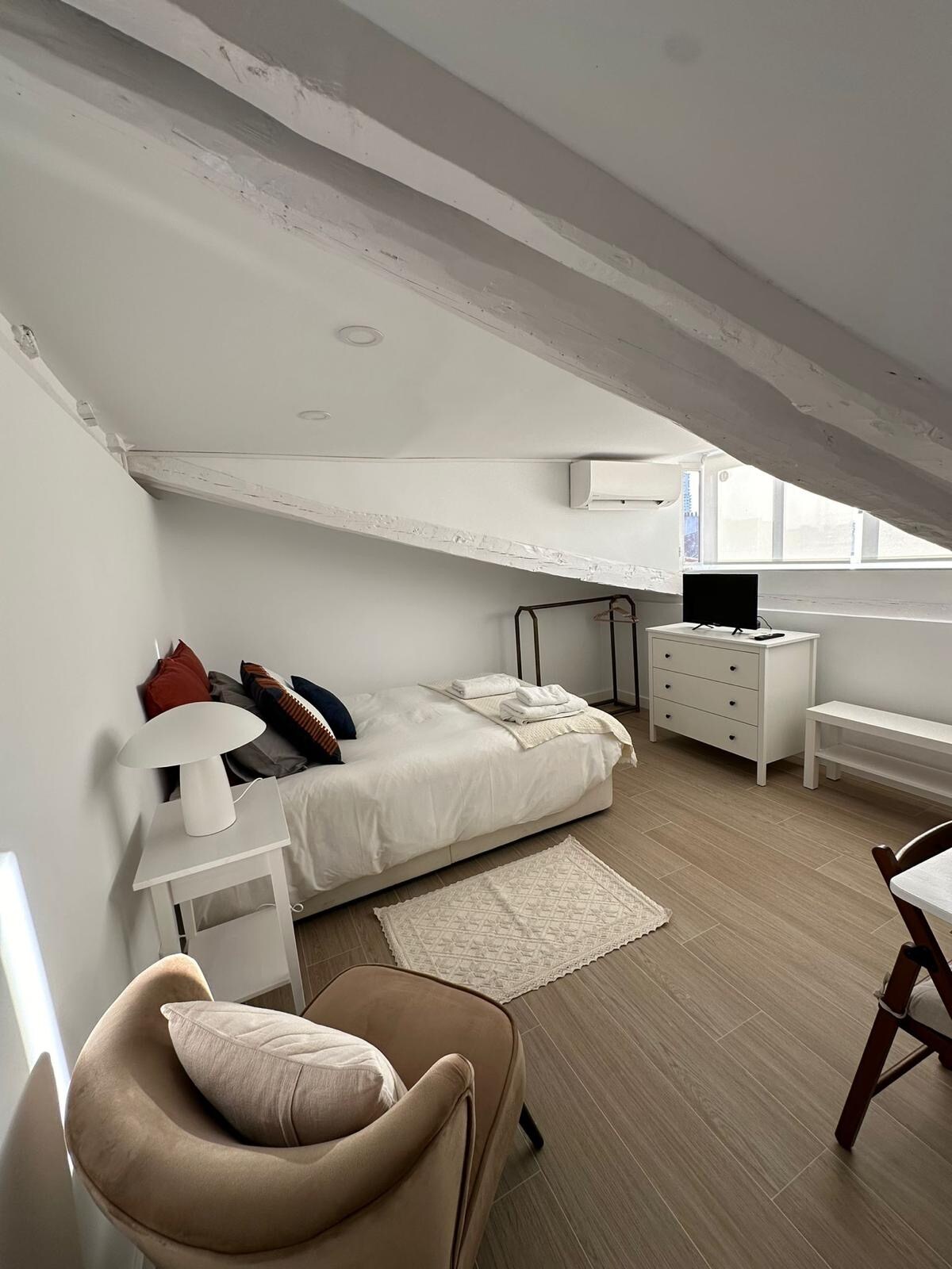 Bright and cozy loft in the heart of Malasaña, one of Madrid’s most vibrant and creative neighborhoods. With 40 m², high ceilings, and exposed wooden beams, it has a warm, character-filled atmosphere. It includes a fully equipped kitchen, living area with sofa, comfortable bed, and a compact bathroom once used during photo sessions. Originally my photography studio, it retains its open layout, artistic spirit, and unique charm, perfect for couples’ getaways.