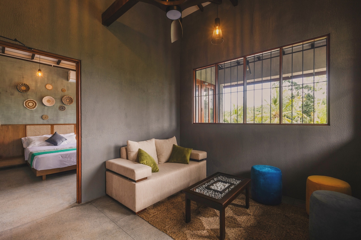 * Teraz z klimatyzacją* Jasny, przewiewny apartament z balkonem i częściowo otwartą łazienką oraz wspólnym basenem, położony naprzeciwko pola cynamonu w spokojnym, zielonym miejscu. To idealna baza wypadowa, z której można cieszyć się Hikkaduwą, w zielonym otoczeniu dżungli.
