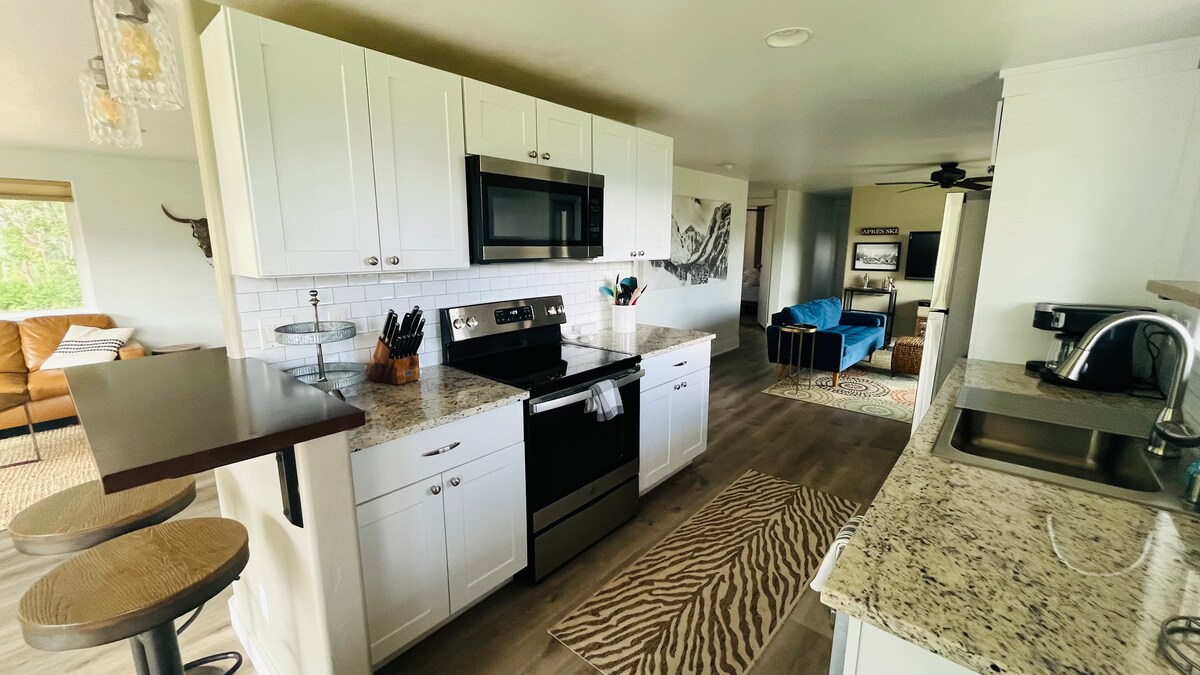 Witamy w naszym nowo wyremontowanym kondominium. Ciesz się naszym apartamentem z 1 sypialnią i 1 łazienką i kominkiem gazowym Schody na główną ulicę, kawiarnie, sklep spożywczy, wyciąg narciarski, bary i restauracje. Idealne miejsce na festiwale lub wędrówki z miasta z nieskazitelnym trawnikiem dla relaksu. Rozkładana sofa (dzieci) Nocleg dla 4 osób FreeWiFi Dobrze wyposażona kuchnia z urządzeniami ze stali nierdzewnej, kuchenką gazową i zmywarką. Uliczna karta parkingowa dla strefy G Pralka i suszarka. Zezwolenie na prowadzenie działalności 0335