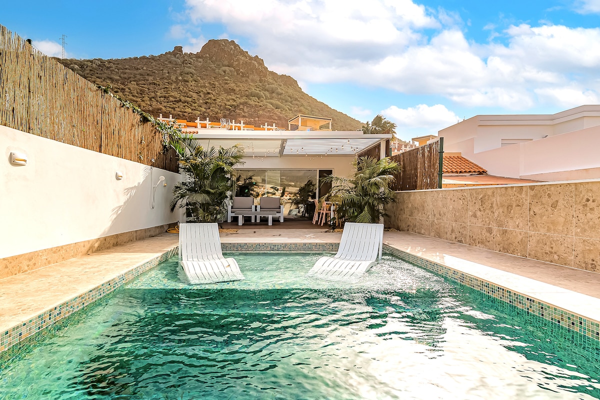 @sleephousetenerife Piękny dom w stylu kanaryjskim z dwoma niedawno odnowionymi pokojami z dużym tarasem i basenem z solarium i strefą relaksu. Dom znajduje się w cichej okolicy z wiejską atmosferą, ale z zaletą, że znajduje się zaledwie 15 minut drogi od plaży. Dom znajduje się na szczycie wzgórza, z którego roztacza się wspaniały i czysty panoramiczny widok na morze. Zachody słońca są wspaniałe z wyspą La Gomera na tle.