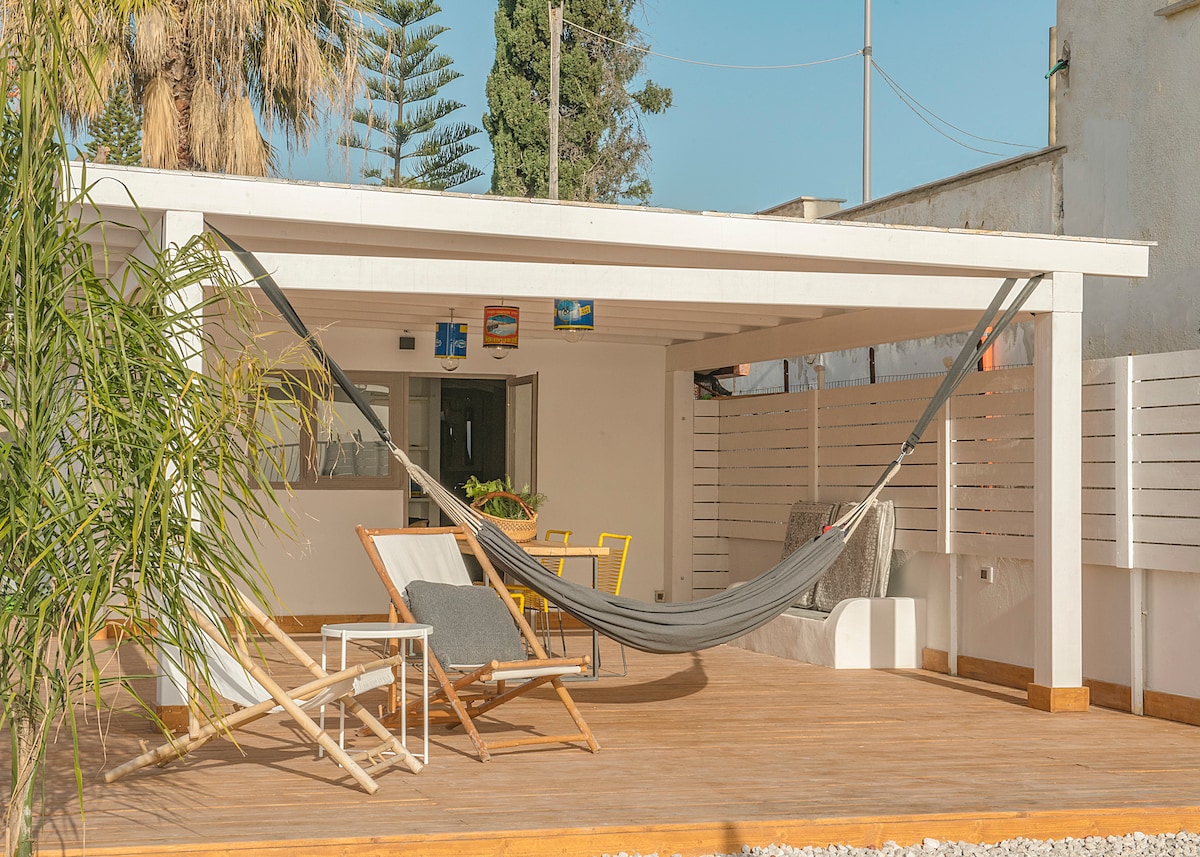 Mała bivani wewnątrz willi, 200 metrów od plaży, składająca się z pokój dwuosobowy z bardzo dużym łóżkiem, szafą na lustrzane stoliki nocne z szufladą , telewizorem, Wi-Fi i zimną/gorącą klimatyzacją. Pokój otwiera się na własny ogród. Salon z aneksem kuchennym , podwójną sofą, 4-osobowym drewnianym stołem, podwójną umywalką, piekarnikiem elektrycznym,lodówką, klimatyzacją , telewizorem,Wi-Fi, pokojem otwiera się na ogród , krzesłami stołowymi, prysznicem na zewnątrz, łazienka z kabiną prysznicową