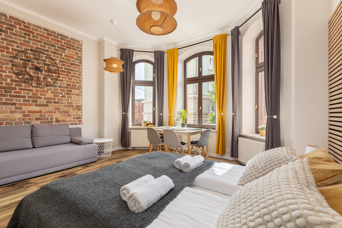 Oryginalny i funkcjonalny apartament Chicago z balkonem oraz widokiem na park i Stary Browar. Na przestrzeni 32 m2 znajdują się: – wydzielona, kameralna część sypialniana; – dzienne miejsce relaksu, gdzie można odpocząć; – wyposażony aneks kuchenny wraz ze zmywarką; – łazienka z prysznicem; – dla gości w części wspólnej żelazko, deska do prasowania, pralka. Apartament zlokalizowany jest w kamienicy na III piętrze bez windy – niskie schody, szeroka klatka schodowa.
