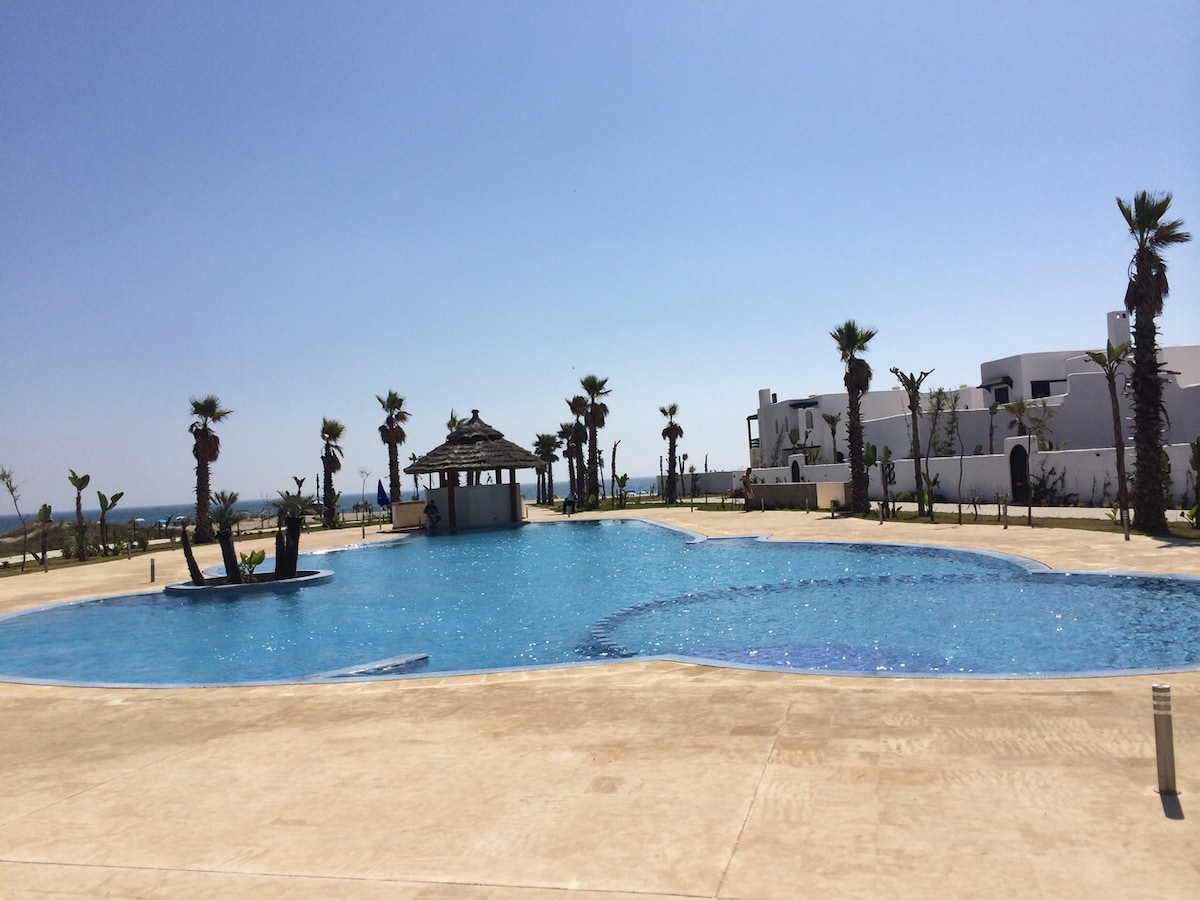Ładne nowe mieszkanie w bezpiecznej prywatnej rezydencji z 3 basenami, placem zabaw dla dzieci, bezpłatnym parkingiem na miejscu i 5 minut od plaży. Apartament składa się z 1 sypialni z łazienką, salonu, jadalni, dobrze wyposażonej kuchni, łazienki z prysznicem oraz dużego, dobrze wyposażonego tarasu. W pobliżu wszystkich udogodnień (kawiarnia, restauracja, apteka i supermarket), apartament znajduje się 10 minut od Martil i M'diq.