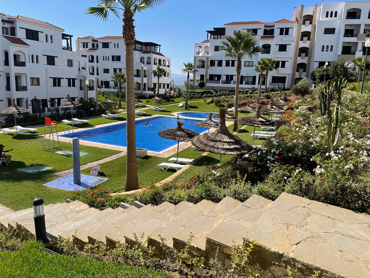 Niesamowite 3-osobowy apartament ze wszystkimi minusami mod w pełni umeblowany z dostępem do 7 wspaniałych basenów, poza siłownią, plac zabaw dla dzieci, prywatny parking 24-godzinna ochrona w pełni odizolowany, darmowe wifi, ten apartament jest wyposażony w wspaniałe widoki na góry, odległość do plaży, to mieszkanie znajduje się w północnej części Maroka.