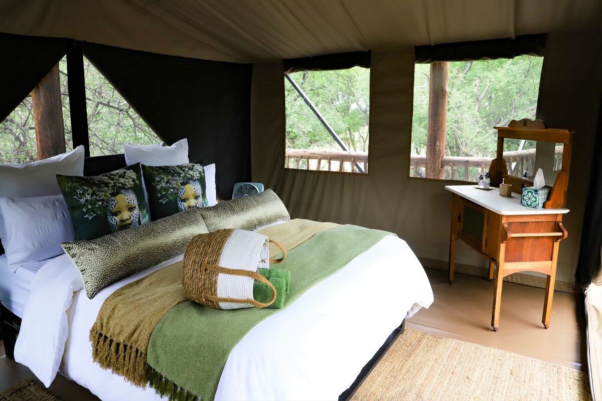 The Bushbabies' Nest was created for guests to have an 'under the stars' lodging experience in the bushveld. This adventurous and eco friendly accommodation consists of a 6 meter-high wooden structure. On the ground level you can find a 'bush kitchen' facility, the bathroom and also an outdoor barbeque area and a splash pool that has a spectacular view of wildlife that graze upon the savannah. 1st floor consists of a luxury tent and and the top level is where you can lay and admire the stars!