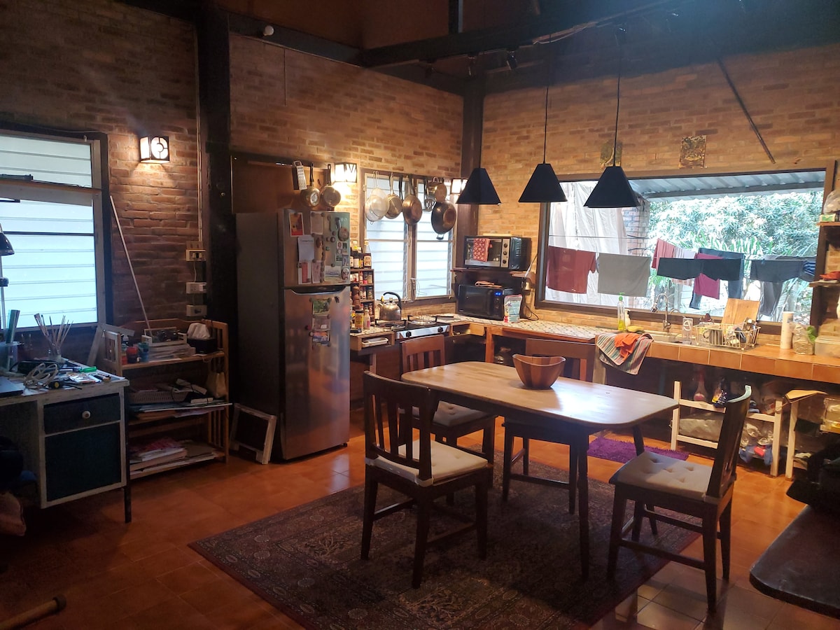 Nasz dom to jedyne w swoim rodzaju miejsce w Chiang Mai – tylko dla prawdziwych miłośników przyrody! Przytulny i cichy dom otoczony drzewami – z dala od tłumów i turystów, ale wystarczająco blisko, aby łatwo wskoczyć w akcję. Proste i wspaniałe – wysokie sufity, ceglane ściany, podłogi z twardego drewna, klimatyzacja, nowe meble, w pełni wyposażona kuchnia Uwaga: - Jeśli nie czujesz się komfortowo, dzieląc swoją przestrzeń z okazjonalnymi małymi ghekosami lub owadami, nasze miejsce nie jest dla Ciebie!