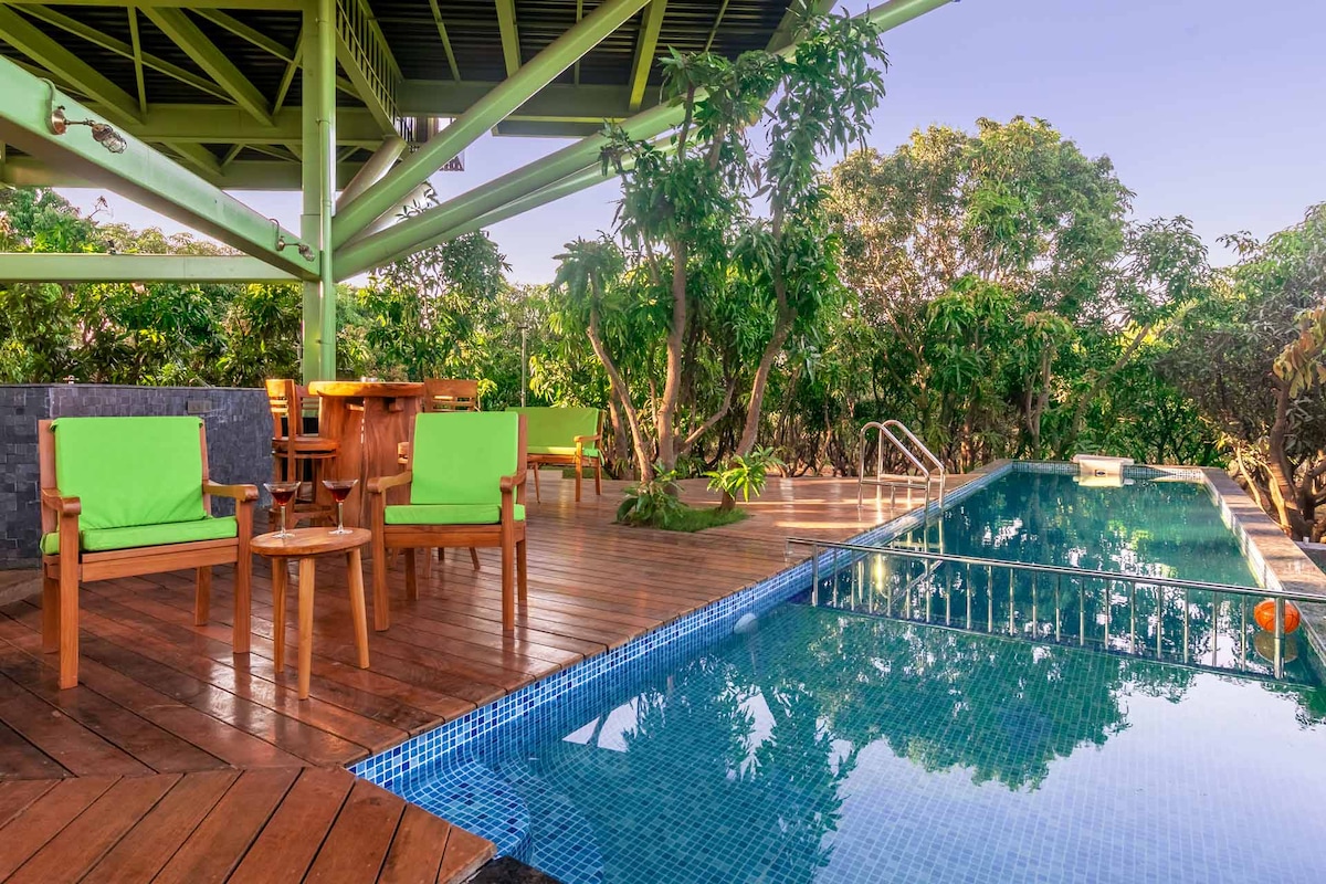 Ta spokojna przestrzeń to 4-pokojowa willa z widokiem na rzekę w Karjat. Położona w otoczeniu zieleni, willa co wieczór wygrzewa się w zachodzie słońca, tworząc własny piękny obraz! Machan, gdzie można delektować się poranną kawą, ogromny taras nad rzeką, gdzie można grillować, a nawet ćwiczyć poranną jogę, basen, w którym można popływać i zdrzemnąć się, ogród, w którym dzieci i zwierzęta mogą się bawić, 6-osobowe jacuzzi, w którym można rozluźnić mięśnie, kuchnia na świeżym powietrzu i jadalnia itp. Więc zrelaksuj się, odkrywaj, żyj! * Proszę nie rezerwować na wieczory kawalerskie!