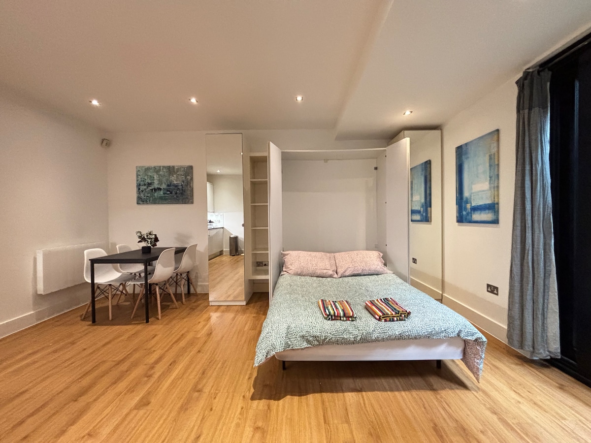 Bardzo centralnie położone, parter, niedawno odnowione, podwójne łóżko, oddzielna kuchnia, prywatne patio, prywatne wejście, miejsce do pracy, miejsce do siedzenia, stół, pralka, suszarka, podwójna lodówka, w sercu Londynu, blisko wszystkiego. W odległości spaceru od większości centralnych stacji metra w Londynie i stacji Eurostar. Miejsce dla 2 osób. Zaledwie kilka przecznic dalej znajdziesz dzielnice handlowe Oxford Street, Regent Street i Bond Street, bary i restauracje w Soho, muzea, teatry i targ w Covent Garden.