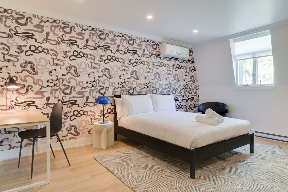 Poczuj duszę Montrealu! Ten uroczy prywatny apartament znajduje się 1 minutę od tętniących życiem restauracji, kawiarni i życia nocnego w najbardziej popularnej dzielnicy miasta. Spacer do Old Port (15 min), Quartier des Spectacles (6 min) i niekończącej się rozrywki. Twój idealny obóz w Montrealu oferuje wygodne łóżko typu queen, klimatyzację, dostęp do Netflixa i bezproblemowe wejście bez klucza. Ostatni goście zachwycają się: „Ukryty skarb w tej cenie!” i „Lokalizacja jest bezkonkurencyjna!” Zakochasz się w Montrealu? Zarezerwuj swój miejski wypad już dziś!