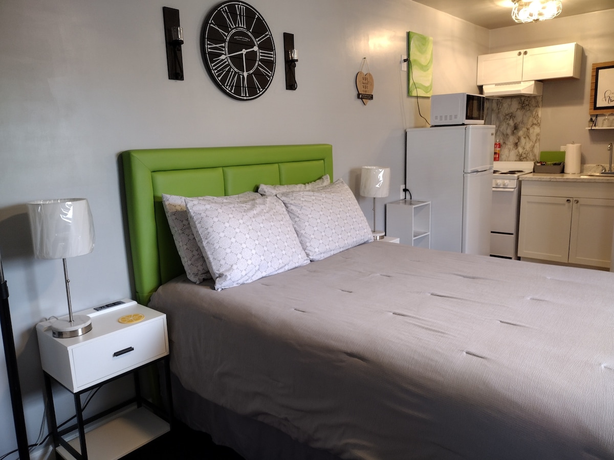 Przestronny apartament z dwoma pokojami, w jednym pokoju znajduje się łóżko typu queen size, a w drugim pokoju łóżko pojedynczeczne oraz sofa futon. Prywatna łazienka. Przyjazne dla dzieci. Lodówka z napojami do dyspozycji. Oddzielna regulacja ogrzewania i chłodzenia. Wysoki sufit. Położony w dobrej okolicy. W odległości spaceru od centrum miasta, nabrzeża, restauracji i miejsc koncertowych, takich jak uniwersytecki River Campus. Z przodu znajduje się szeroki ganek i duży staw ze złotymi rybkami. Apartament znajduje się na drugim piętrze domu.