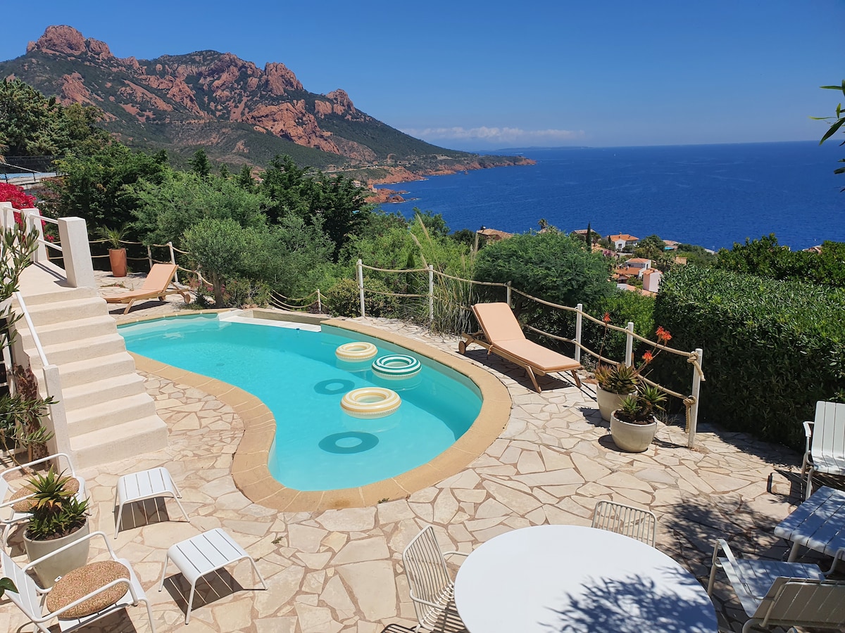 Dom z widokiem na morze, całkowicie odnowiony, z w pełni wyposażoną kuchnią, łazienką z prysznicem i rozkładaną sofą najwyższej jakości (140 cm) Prywatny taras w cieniu winnic i bugenwilli z widokiem na morze i wybrzeże Esterel. Położony w spokojnej dzielnicy mieszkaniowej Trayas, między Théoule sur Mer i St Raphael, ale blisko nadmorskich kurortów. 10 minut spacerem od plaż i szlaków turystycznych Esterel. Udogodnienia dla niemowląt i małych dzieci na życzenie.