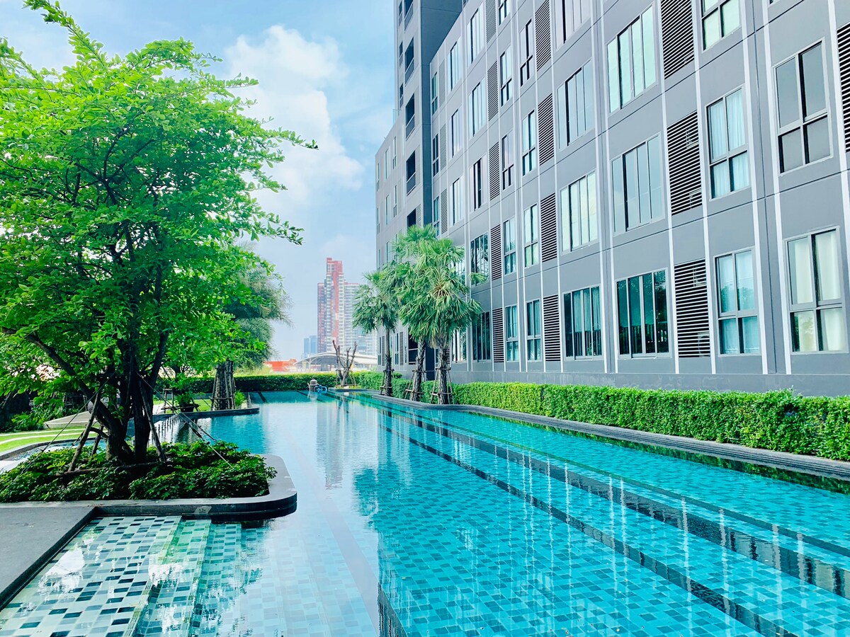 Elevate your stay in Bangkok by reserving our lovely 1 bedroom condo with: - Smart TV (Netflix & Youtube enabled) - comfortable bedding - Dunlopillo (UK) - high-speed wifi - well equipped Gym room - Swimming pools - convenient neighbourhoods (convenient store 7-11 & lotus; Food & night markets, massage & local restaurants) It is located close to Bearing BTS Station (6 mins walk with 500m distance) in BangNa area close to BITEC. Our condo is an ideal place for tourists and business professionals