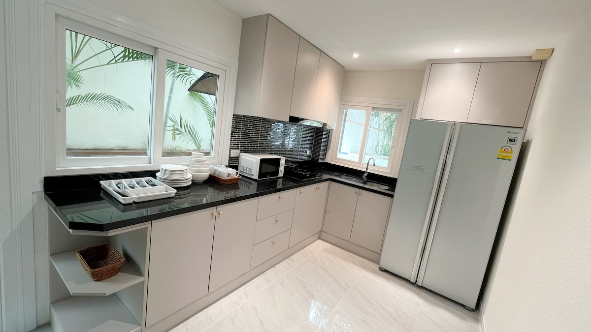 🏡TW泳池别墅 – 现代奢华风格 欢迎来到TW别墅,这是一处融合现代舒适与精致设计的度假空间。无论是家人团聚还是朋友聚会,这里都能为您带来惬意与难忘的住宿体验。 ✨ 舒适空间 单层别墅,建筑面积约160平方米,设有4间卧室和5间浴室。每间卧室均配备独立卫浴,另设一间客用浴室,格局合理,入住体验更为舒适。 🛏 卧室配置 四间卧室中,三间配有1.8米大床,一间配有1.5米床,满足不同入住需求,适合家庭或朋友共享美好时光。 🍳 厨房与餐饮 厨房设施齐全,配备全套烹饪设备,让您轻松下厨,享受居家般的便利与温馨。 🏊 私人泳池 别墅配有私人泳池,水质清澈,是您畅享清凉与放松的理想之地。并提供每周三次清洁服务,确保环境洁净舒心。 🔥 户外休闲 别墅设有烧烤炉及宽敞的户外聚会空间,非常适合与亲友共度欢乐的派对时光。 📺 娱乐设施 每间卧室均配备独立电视,客厅另设大屏幕电视,全屋覆盖高速无线网络,带来丰富便捷的娱乐与连接体验。 🎨 现代风格 别墅采用现代奢华设计风格,简约大气,兼具舒适与优雅,让您的假期更加惬意。