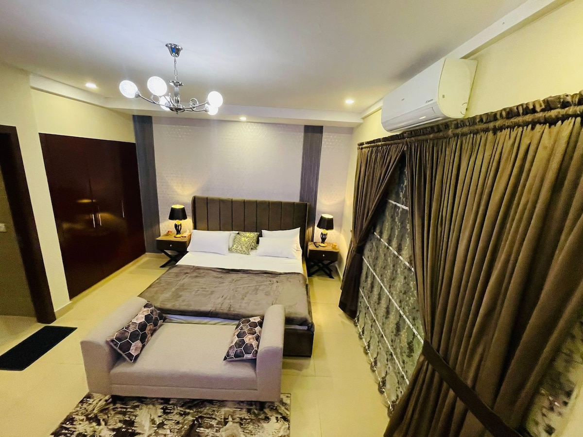 Witamy w naszych stylowych apartamentach z dwiema sypialniami w DHA 5 Islamabad. Ciesz się wygodą szybkiego dojazdu do pracy i zrelaksuj się w przestrzeni z pięknym wystrojem i w pełni wyposażonym kinem domowym. Idealny dla podróżnych szukających wygody i rozrywki, ten przytulny ośrodek oferuje nowoczesne udogodnienia w doskonałej lokalizacji. Jest to całkowicie oddzielna część z własnym wejściem i parkingiem, przyjazna rodzinom, a więc bardzo bezpieczna i spokojna. Imprezy i głośna muzyka są niedozwolone. Pary niezamężne są niedozwolone.