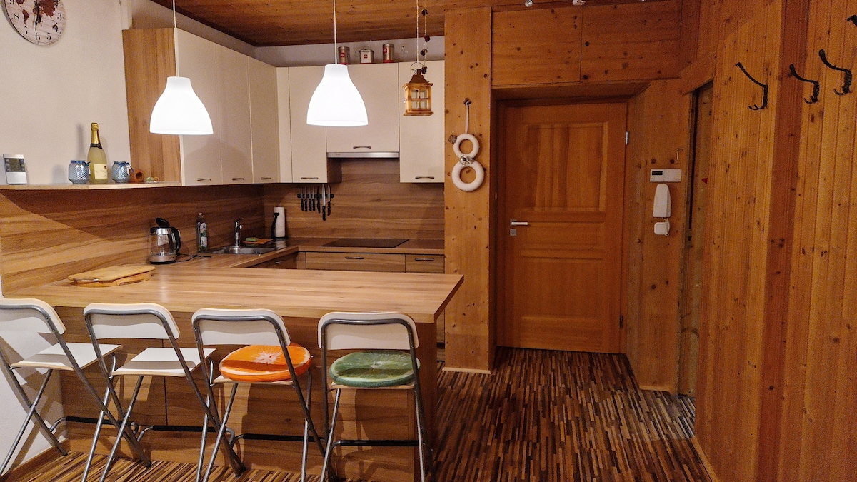 Wysokiej jakości odnowiony apartament o powierzchni 120 m2 z nowoczesną kuchnią, rustykalnym salonem z gigantyczną sofą i systemem kina domowego (Sky, Netflix itp.), przytulną kuchenką kafelkową, dużą łazienką (prysznic parowy, wanna, podwójna toaleta, pralko-suszarka, drążki do suszenia) i dużą szatnią. 3x pokój dwuosobowy (po 2 osoby) Opcjonalnie: 1x sofa w salonie (2 osoby) Ponadto, powiązana piwnica narciarska, szeroki teren na zewnątrz z ogrodami i zwierzętami gospodarskimi oraz powiązane miejsca parkingowe!
