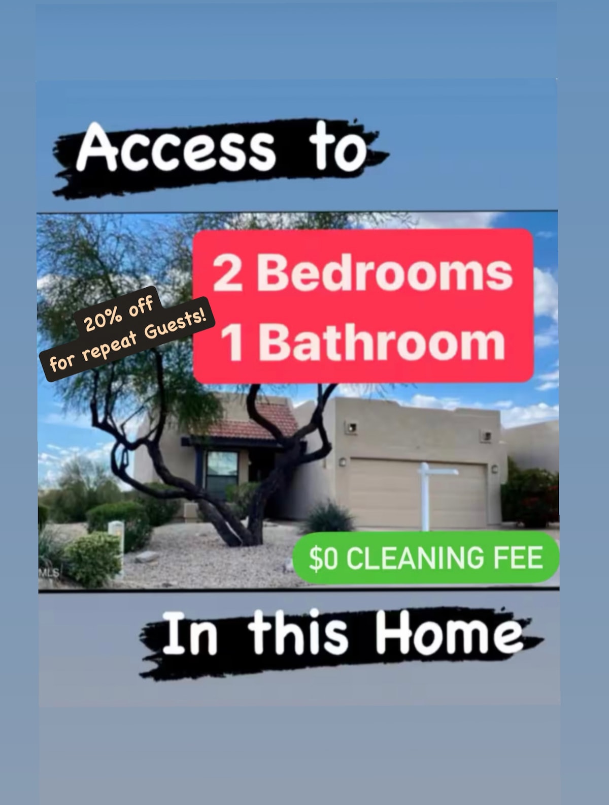 Przytulne studio. Łóżko typu Queen i łóżko składane w razie potrzeby, łazienka 3/4, mikrofalówka, 42-calowy telewizor z płaskim ekranem z Prime Video. WiFi. Prywatne wejście. Centralnie położony. Blisko tego, co przyciąga ludzi w pierwszej kolejności! 5 minut od Talking Stick Resort/Casino i Salt River Fields. 10 minut od Westworld. Blisko centrum miasta, turnieje golfowe, aukcje i pokazy klasycznych samochodów, park wodny. Cicha okolica, szybki dostęp do autostrady SR 101. Cisza i spokój zapewnione! PRZED dokonaniem rezerwacji PRZECZYTAJ CAŁĄ OFERTĘ, W TYM REGULAMIN DOMU, aby uniknąć niespodzianek.