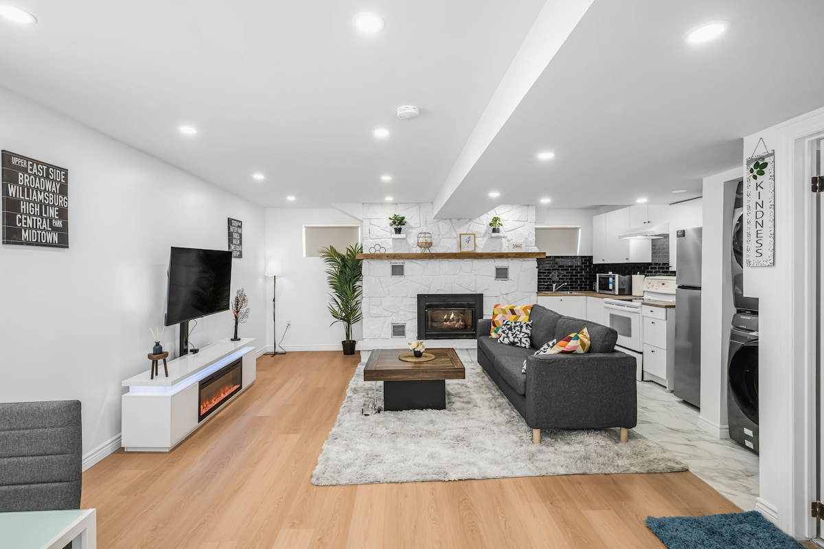 Piękny, jasny, otwarty dom z 3 sypialniami i 2,5 łazienkami! Spokojna ulica, kilka kroków od centrum Thorold – sklep spożywczy, restauracje i sklepy; kilka minut od centrów handlowych/outletów; 15 minut od wodospadów Niagara Falls; ~20 minut od Niagara on the Lake / winnice:). Dobrze wyposażona kuchnia dla smakoszy, idealna do rozrywki, kamienne blaty. Otwiera się na jadalnię + salon z kominkiem i telewizorem Smart TV. Bezprzewodowy. Ogrodzone podwórko, grill, miejsca na zewnątrz. Duży podjazd i garaż. Na górze 3 sypialnie, 2 łazienki (główna łazienka i prywatny taras).