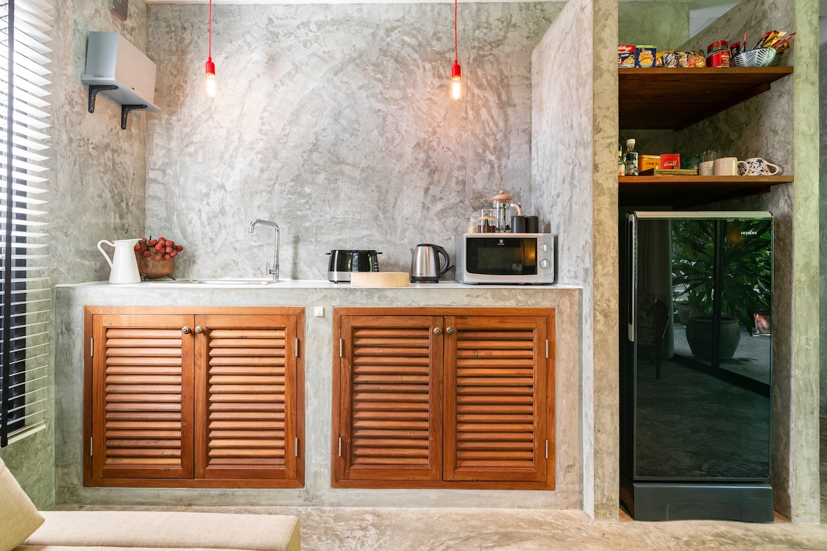 This beautiful Japanese-inspired 55 sqm unit has everything you need for a pleasant stay. The bedroom king-sized bed and personal workspace, and opens onto a spacious semi-outdoor bathroom with a wooden ofuro tub that fits two, and leads to a large walk-in closet. The living room includes a cozy sofa bed and a Ultra HD Smart TV. The kitchen is well-equipped with a microwave, range-hood, electric hob and refridgerator. The large picture window offers a view of the gardens and swimming pool.