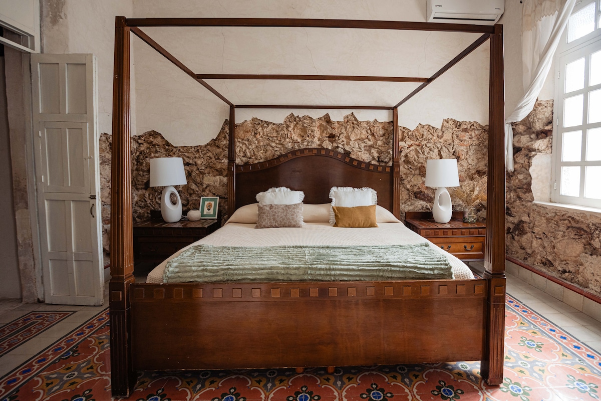 Przestronny apartament w domu kolonialnym, idealny dla 2 osób. Znajduje się na wschód od centrum Méridy, w pobliżu dzielnicy ChemBech, zaledwie 20 minut spacerem od głównego placu. Przyjmuje podróżnych szukających spokoju i introspekcji. Wyjątkowy styl i styl, z luksusowymi wykończeniami, gwarantuje prywatność z dala od zgiełku śródmieścia. Mieszkanie jest całkowicie prywatne, na niższym piętrze. Posiada w pełni wyposażoną kuchnię i salon, basen, ogród, taras, sypialnię z łóżkiem typu king i marmurową łazienką.
