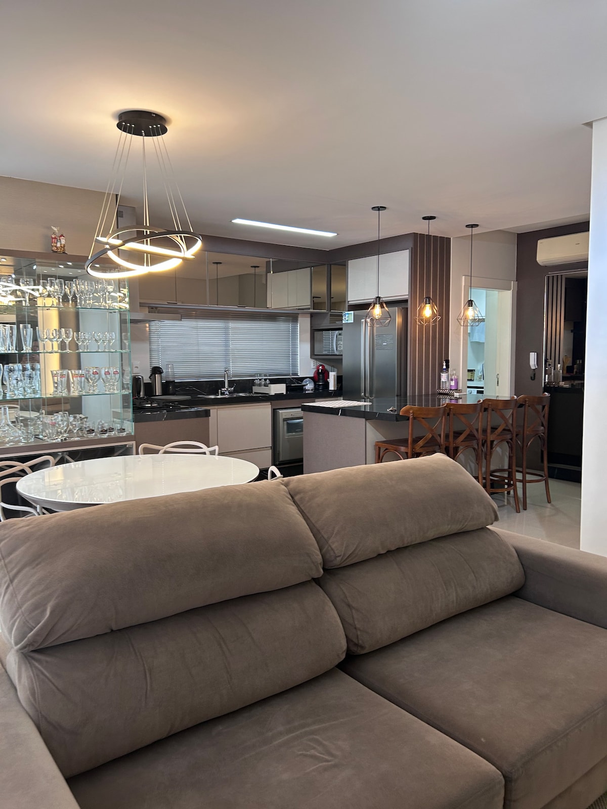 Nowoczesne, eleganckie i wysokiej klasy mieszkanie w Meia Praia, zaledwie 450 metrów od morza. Są 3 apartamenty, klimatyzacja, prywatny grill, biuro domowe i 3 miejsca parkingowe. Piękny widok na rzekę Perequê i przyrodę, znajduje się na cichej i dzielnicowej ulicy, blisko wszystkiego. Idealne dla rodzin, par i grup, które chcą komfortu, strategicznej lokalizacji i praktyczności, aby wszystko zrobić na piechotę.