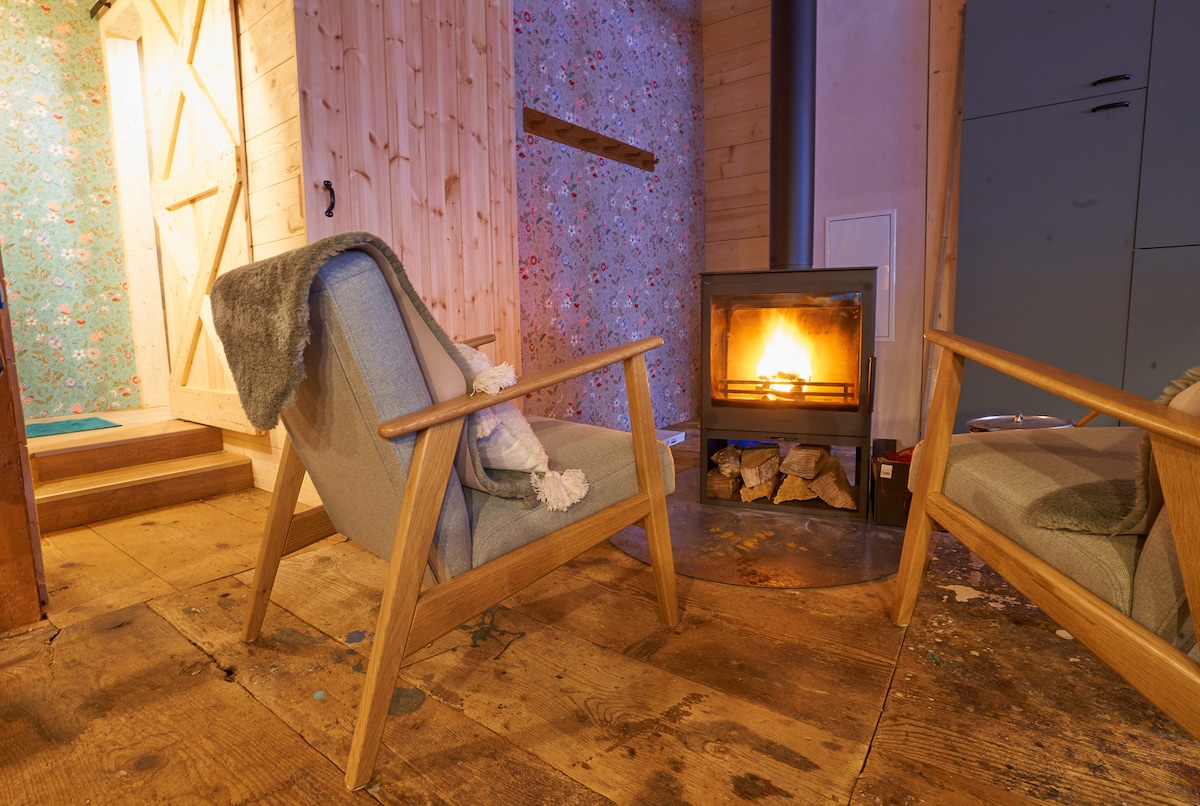 🌞 18.-25.1.: Sonne pur in Hinterzarten 🌞 Idyllisch und ruhig gelegen: das Panoramastudio. Dennoch nur 900m zum Bahnhof. Ein Wohlfühlort für zwei. Warmes Holz und schlichtes Weiß bestimmen den Raum. Der Blick zur Kesslerhöhe bringt den Schwarzwald herein. Für kuschelige Winterabende kannst Du den Kamin anheizen. Zum Relaxen lädt ein Sofa vor dem Kamin ein. Außerdem lässt sich das Sofa mit einem Griff in ein komfortables Bett verwandeln. Ansonsten ist die Einrichtung schlicht und zweckmäßig.