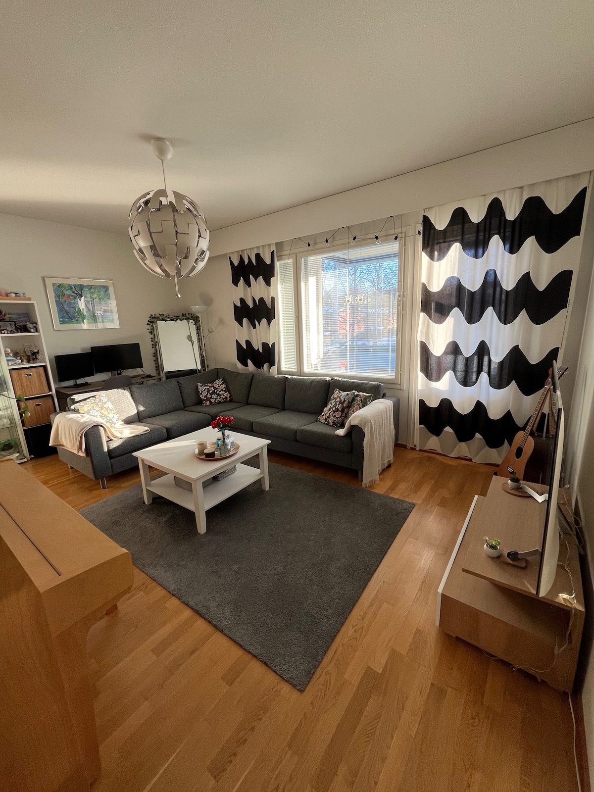 Przytulny trójkąt o powierzchni 55,5 metrów kwadratowych w centrum Joensuu, w pobliżu głównej biblioteki, hali widowiskowej Arena oraz uniwersytetu. Najbliższy sklep spożywczy znajduje się w odległości zaledwie 100 metrów. Miejsca dla sześciu osób. Mieszkanie znajduje się na pierwszym piętrze apartamentowca, ale nie na poziomie gruntu. Wyposażenie obejmuje ręczniki, pościel, mydło, suszarkę do włosów, suszarkę do prania, podstawowe przybory do gotowania, zmywarkę, lodówkę, mikrofalówkę, piekarnik, kuchenkę, ekspres do kawy i czajnik, toster, 55-calowy telewizor i WiFi.